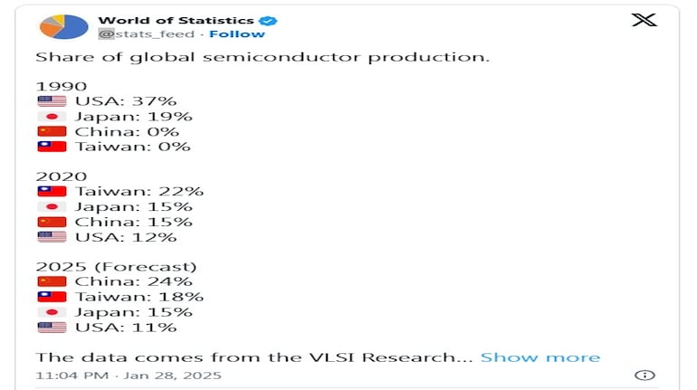 ટેકનોલોજીને લઈને અમેરિકા અને ચીન વચ્ચે મડાગાંઠ છે. સેમિકન્ડક્ટરના વિશ્વ પ્રોડક્શનમાં ચીને અમેરિકાને ઘણું પાછળ છોડી દીધું છે. એવું માનવામાં આવે છે કે આ વર્ષે ગ્લોબલ સેમિકન્ડક્ટર પ્રોડક્શનમાં ચીનનો હિસ્સો 24 ટકા સુધી પહોંચશે જ્યારે અમેરિકા 11% સાથે ચોથા સ્થાને સરકી જશે. પરંતુ 1990માં, અમેરિકા 37% સાથે પ્રથમ ક્રમે હતું, જ્યારે ચીને સેમિકન્ડક્ટર પ્રોડક્શનમાં પોતાનો ખાતો પણ ખોલ્યો ન હતો. તે સમયે જાપાન 19% સાથે બીજા ક્રમે હતું. પરંતુ આજે પરિસ્થિતિ સંપૂર્ણપણે બદલાઈ ગઈ છે. વર્ષ 2020 સુધીમાં, ચીને સેમિકન્ડક્ટર્સની દુનિયામાં અમેરિકાને પાછળ છોડી દીધું હતું. ત્યારબાદ ગ્લોબલ પ્રોડક્શનમાં 22% હિસ્સા સાથે તાઇવાન પ્રથમ ક્રમે હતું, જ્યારે જાપાન 15% સાથે બીજા ક્રમે હતું અને ચીન 15% સાથે ત્રીજા ક્રમે હતું. અમેરિકા 12% હિસ્સા સાથે ચોથા ક્રમે હતું. VLSI રિસર્ચ પ્રોજેક્શન SEMI અનુસાર, વર્ષ 2025માં ચીન 24% સાથે નંબર વન પર રહેશે. તાઇવાન 18% સાથે બીજા ક્રમે, જાપાન 15% સાથે ત્રીજા ક્રમે અને અમેરિકા 11% સાથે ચોથા ક્રમે રહેશે.